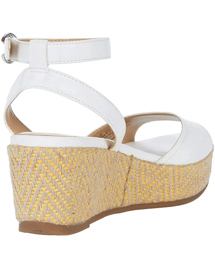 - Espadrille wedge sandal with a textured heel and peep toe.